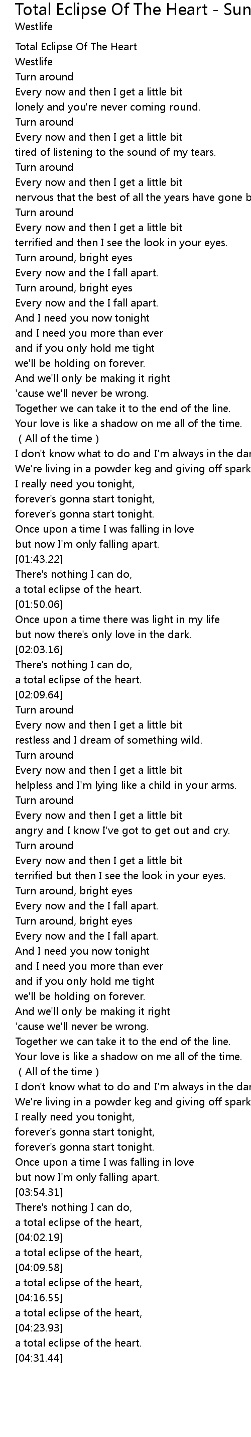 We Have got 10 pic about Total Eclipse Of The Heart Lyrics Long Version images, photos, pictures, backgrounds, and more. In such page, we additionally have number of images out there. Such as png, jpg, animated gifs, pic art, symbol, blackandwhite, pic, etc. If you're searching for Total Eclipse Of The Heart Lyrics Long Version subject, you have visit the ideal web. Our web always gives you hints for seeing the highest quality pic content, please kindly hunt and locate more enlightening articles and pic that fit your interests.